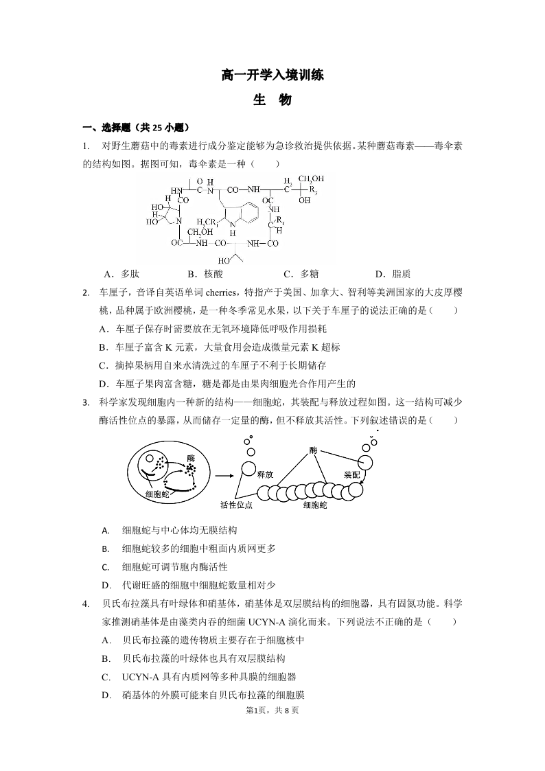 广东省实验中学2024-2025学年下学期2月高一开学考试生物