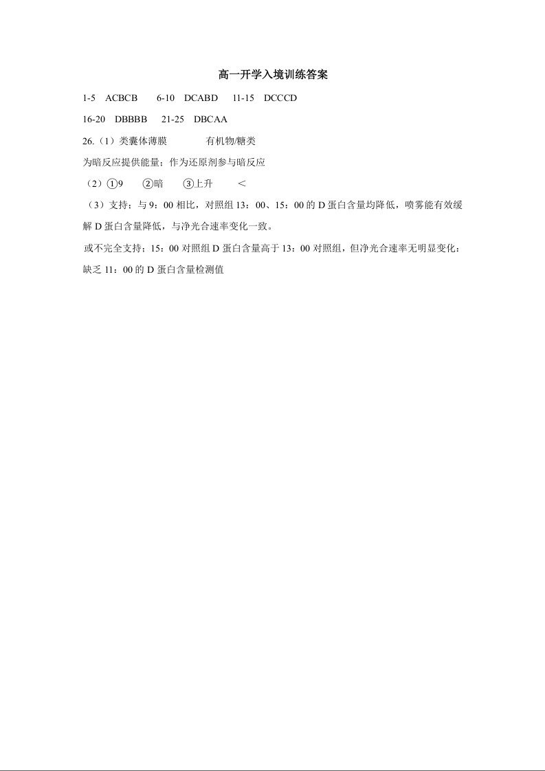 广东省实验中学2024-2025学年下学期2月高一开学考试生物答案