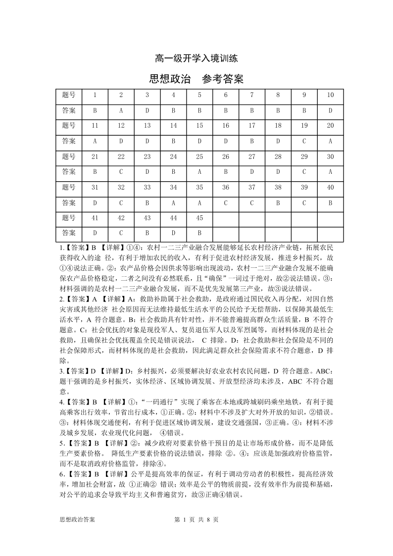 广东省实验中学2024-2025学年下学期2月高一开学考试政治答案