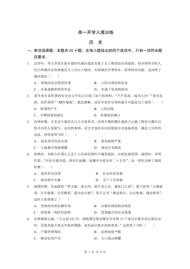 广东省实验中学2024-2025学年下学期2月高一开学考试历史