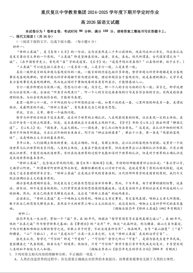 重庆市复旦中学2024-2025学年下学期高二开学定时作业语文