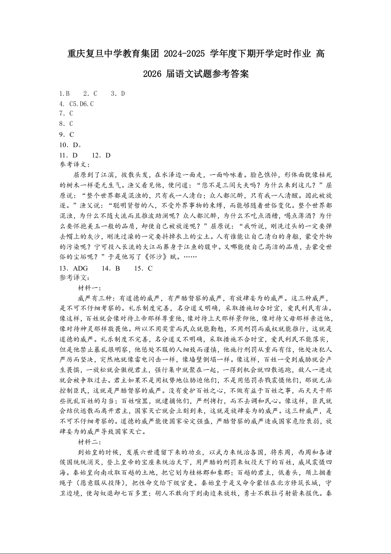 重庆市复旦中学2024-2025学年下学期高二开学定时作业语文答案