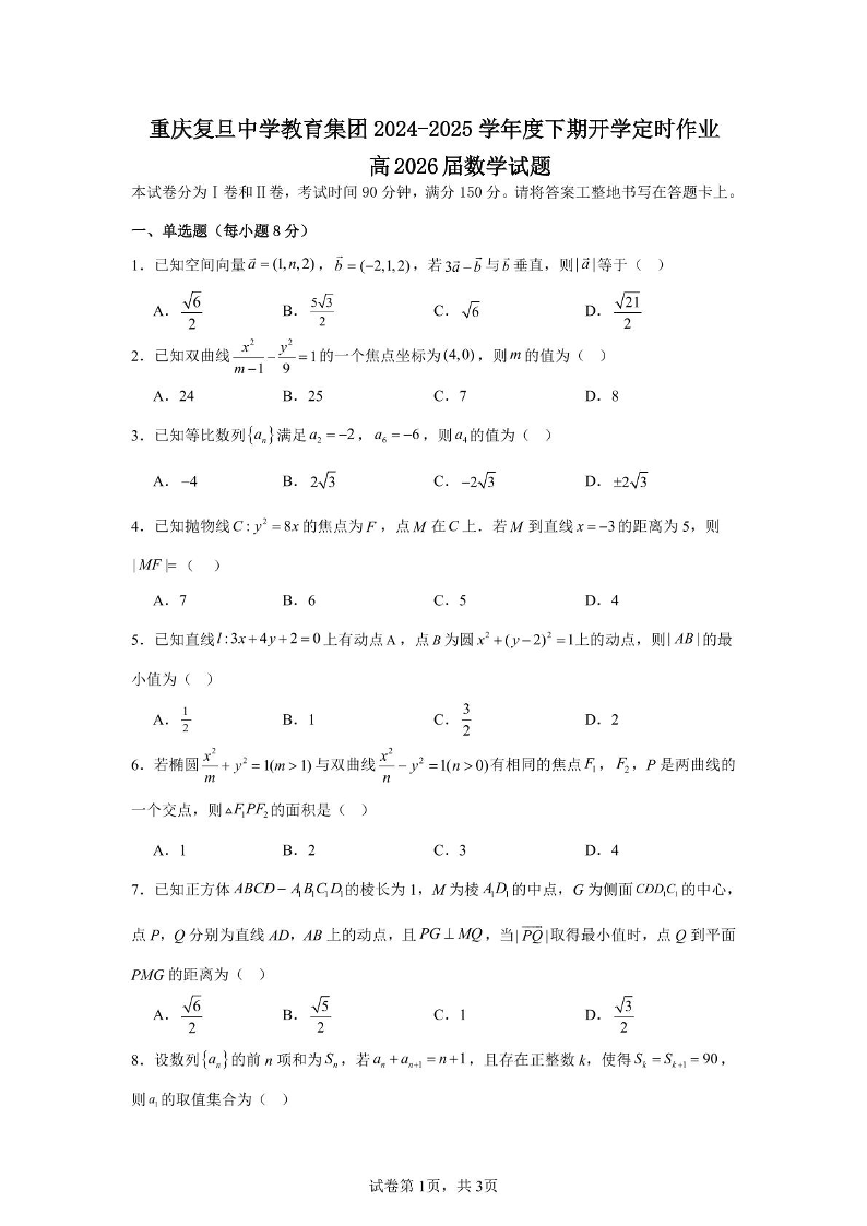 重庆市复旦中学2024-2025学年下学期高二开学定时作业数学