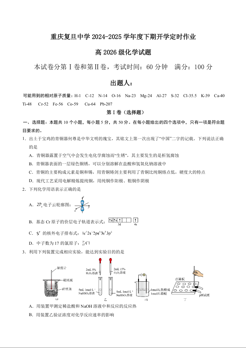 重庆市复旦中学2024-2025学年下学期高二开学定时作业化学