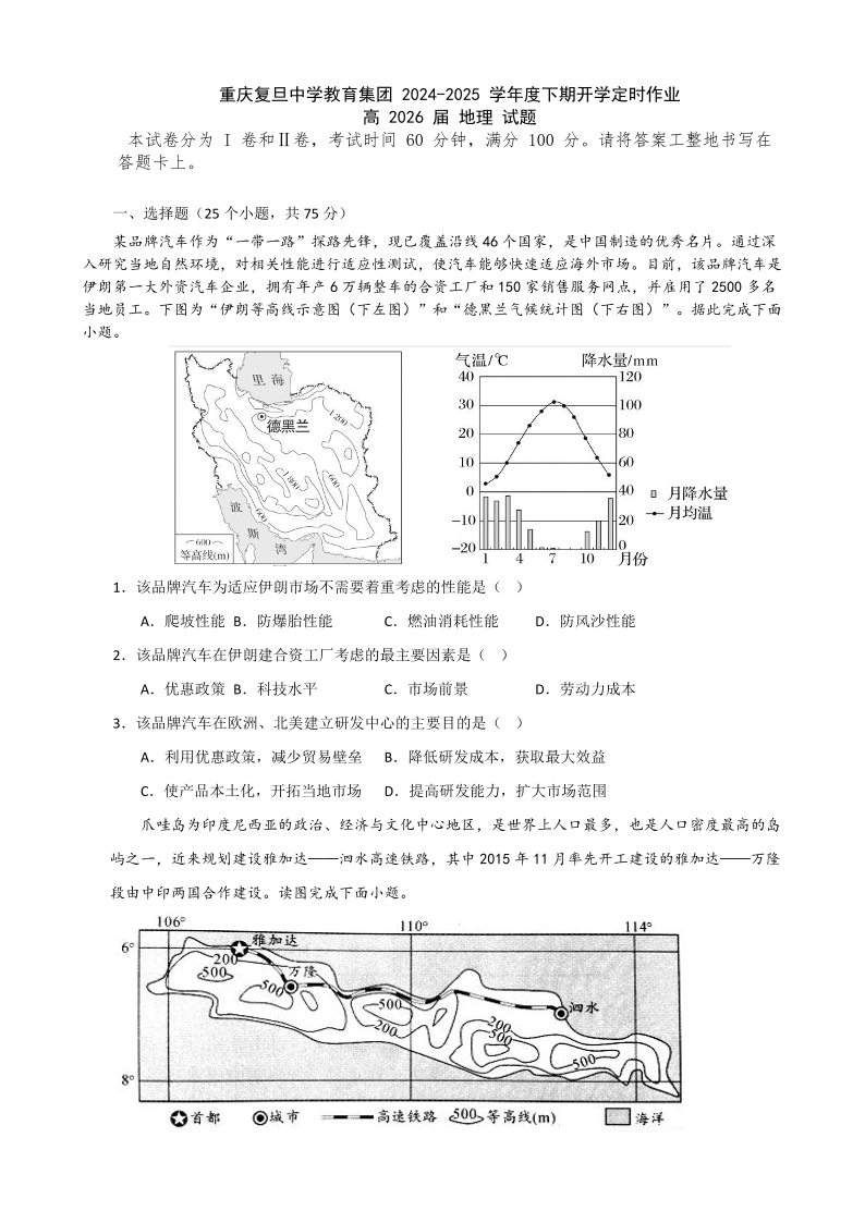 重庆市复旦中学2024-2025学年下学期高二开学定时作业地理