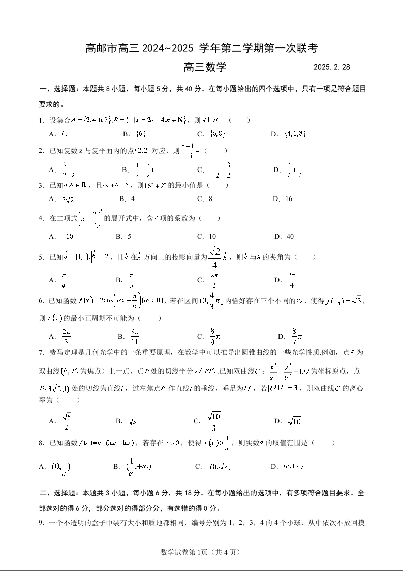 江苏省高邮市2024-2025学年第二学期2月高三第一次联考数学