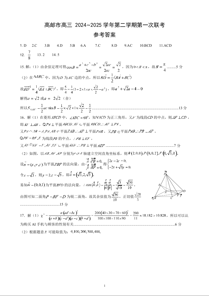 江苏省高邮市2024-2025学年第二学期2月高三第一次联考数学答案
