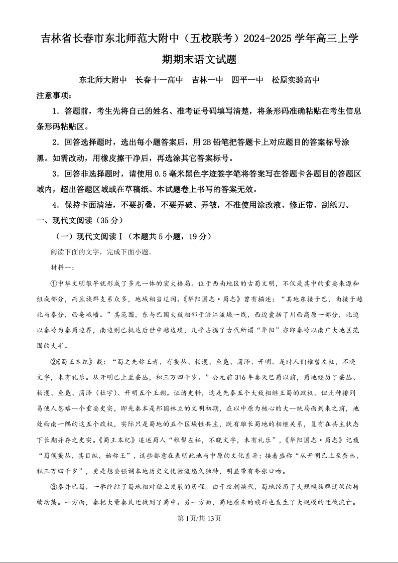 吉林省东北师大附中(五校联考)20224-2025学年上学期1月高三期末考试语文+答案