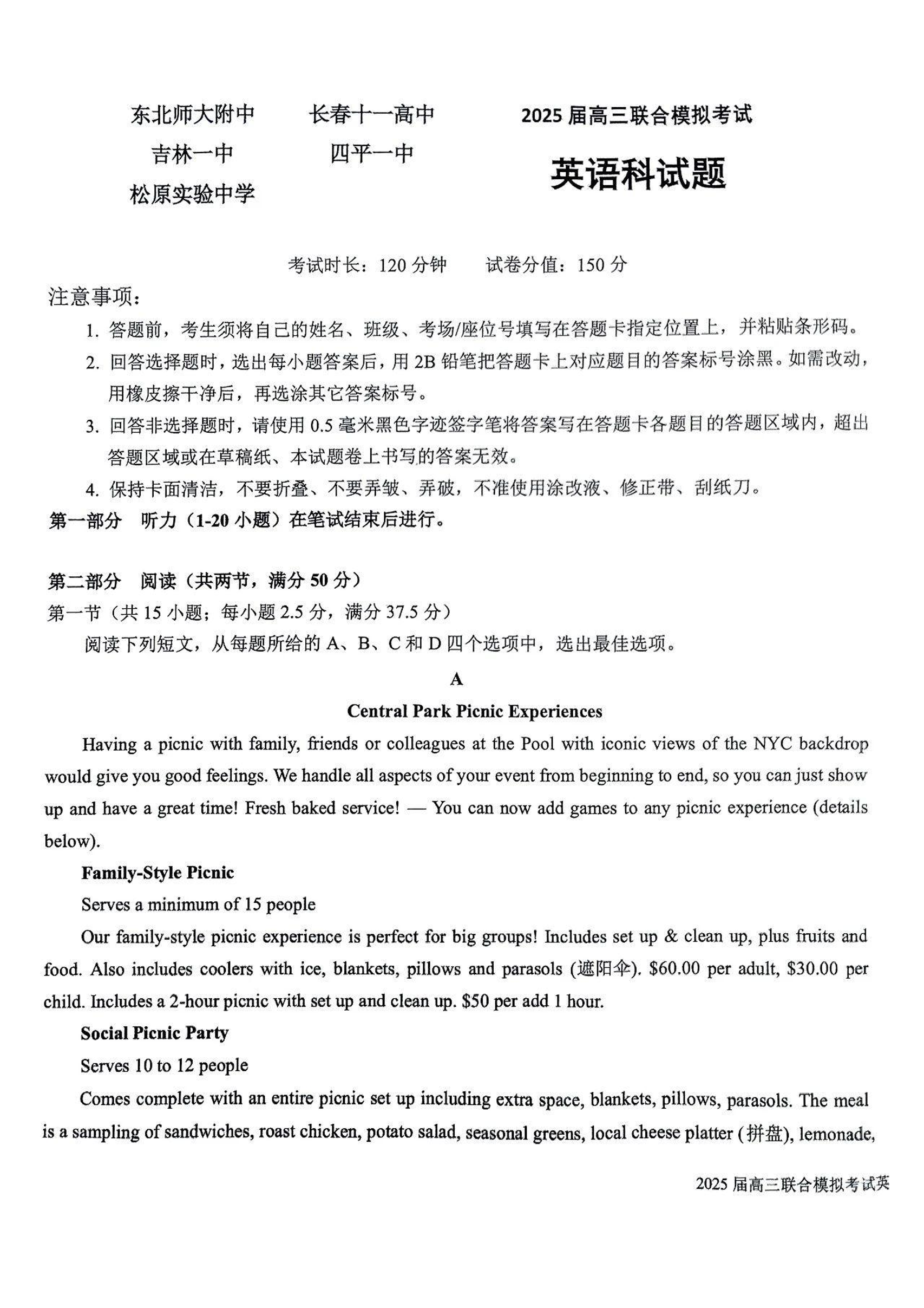 吉林省东北师大附中(五校联考)20224-2025学年上学期1月高三期末考试英语