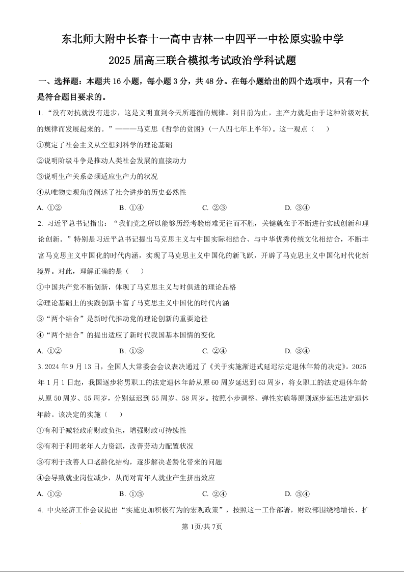 吉林省东北师大附中(五校联考)20224-2025学年上学期1月高三期末考试政治(原卷版)