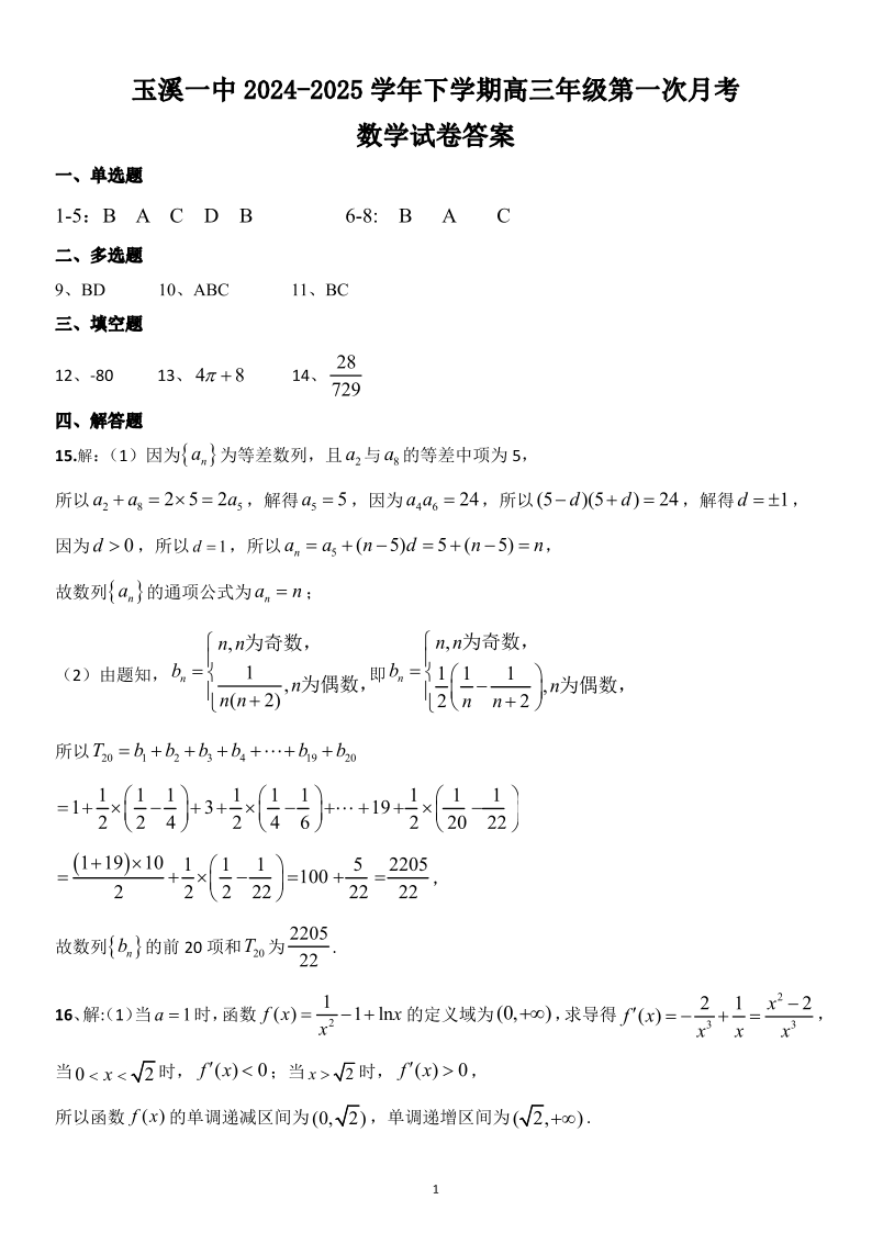 云南省玉溪第一中学2024-2025学年下学期高三第一次月考数学答案