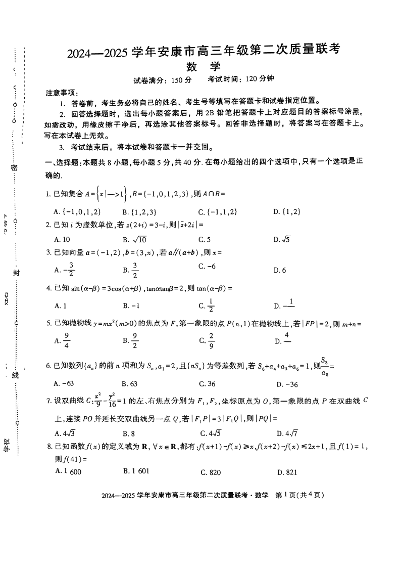 陕西省安康市2024-2025学年下学期高三第二次质量联考(二模)数学