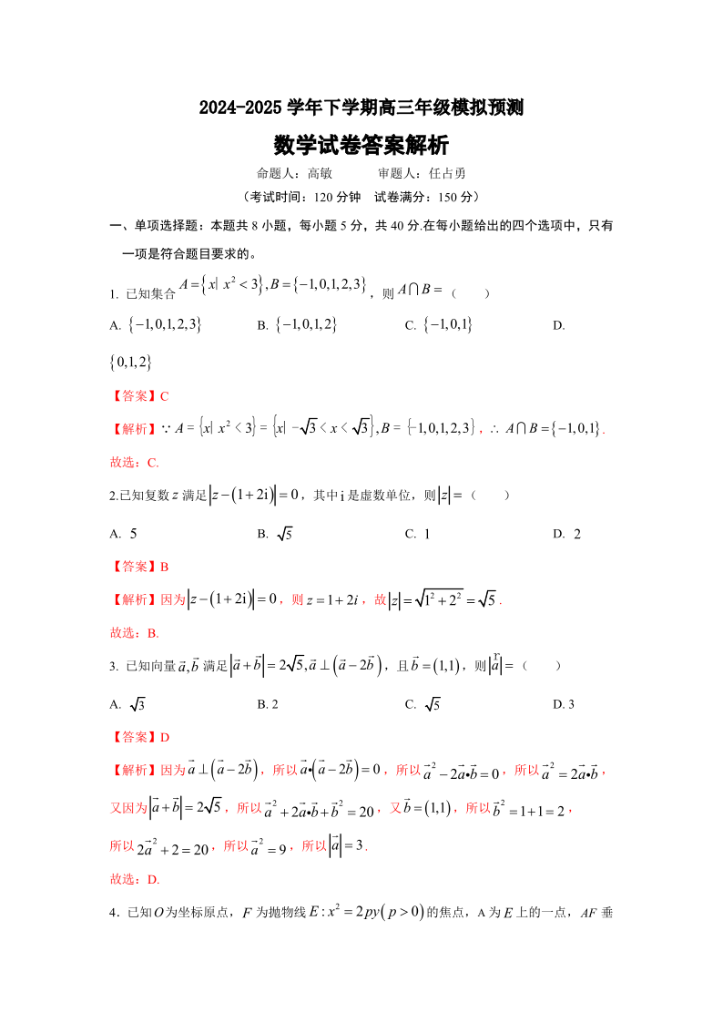 河南省郑州中学2024-2025学年下学期3月高三模拟预测数学数学答案