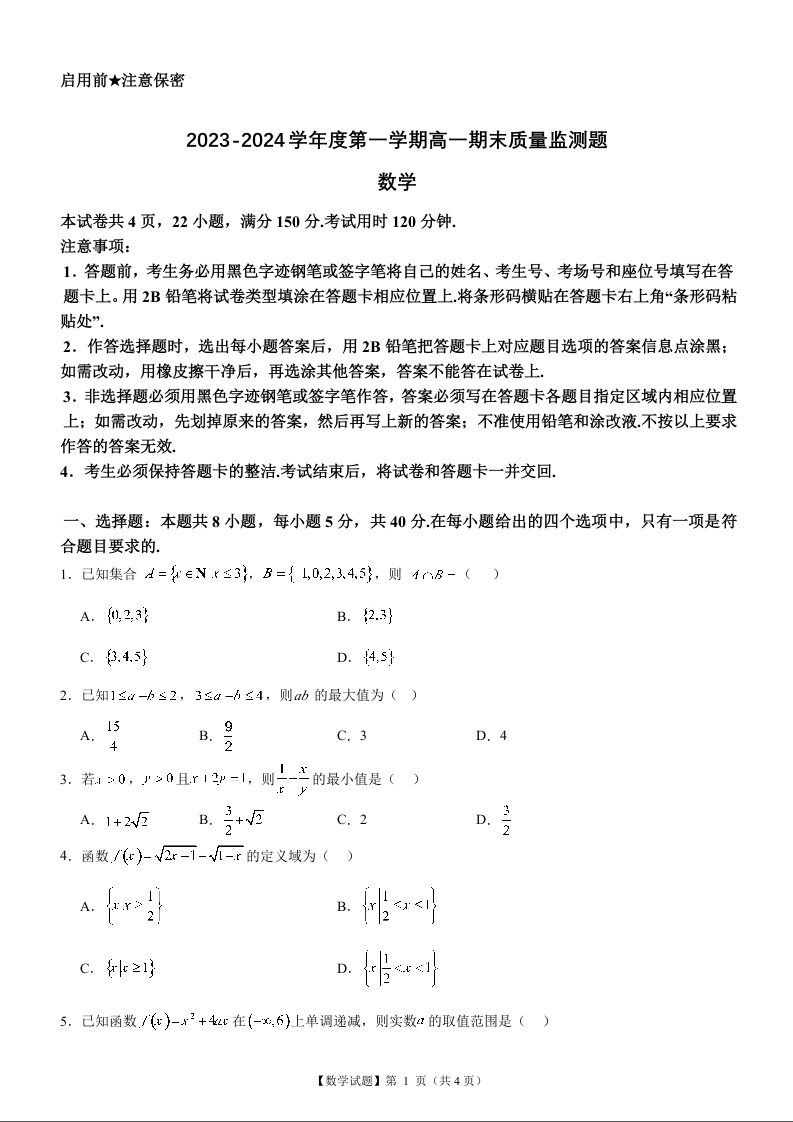 广东省阳江市高新区2023-2024学年高一上学期1月期末测试数学+答案