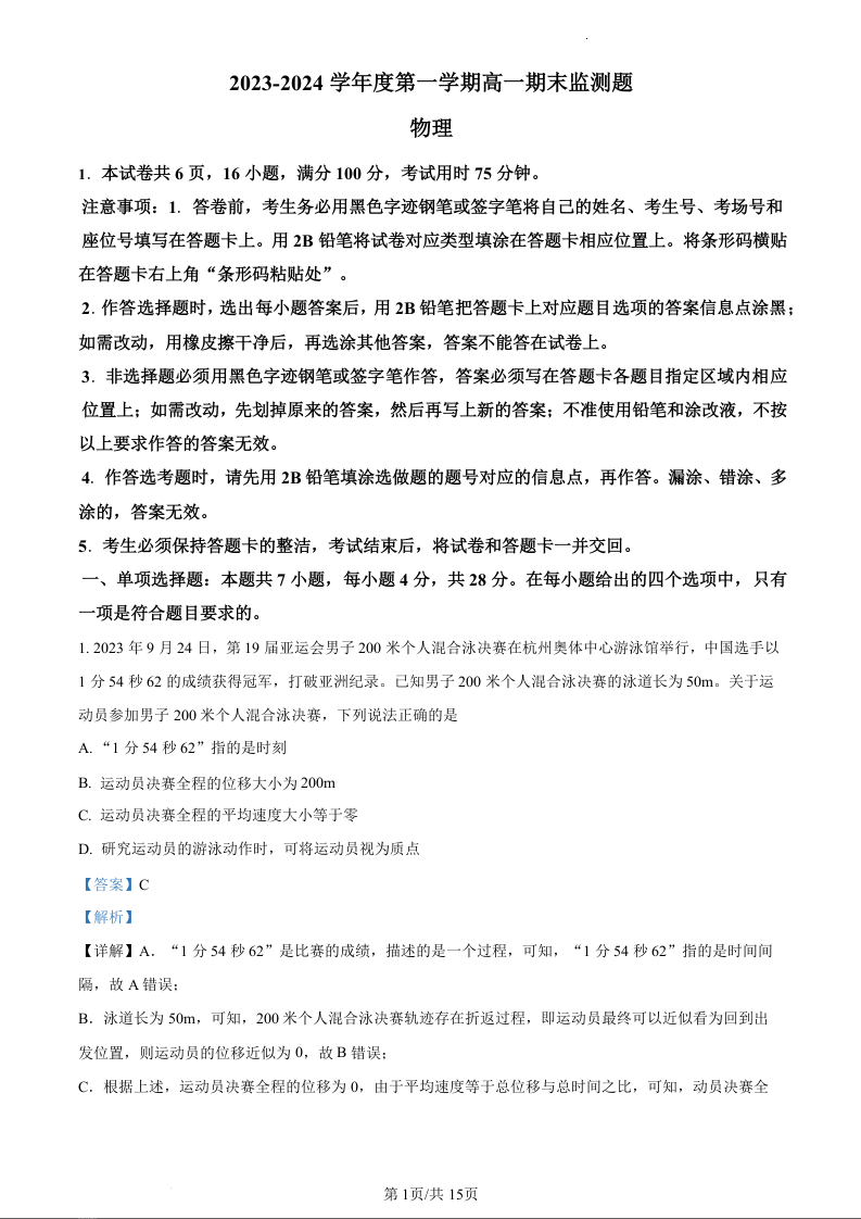 广东省阳江市高新区2023-2024学年高一上学期1月期末测试物理(精品解析版)