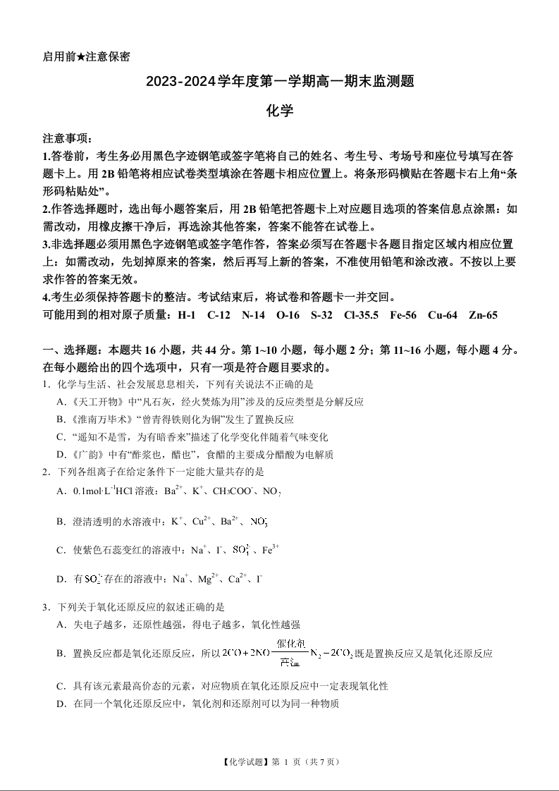 广东省阳江市高新区2023-2024学年高一上学期1月期末测试化学+答案