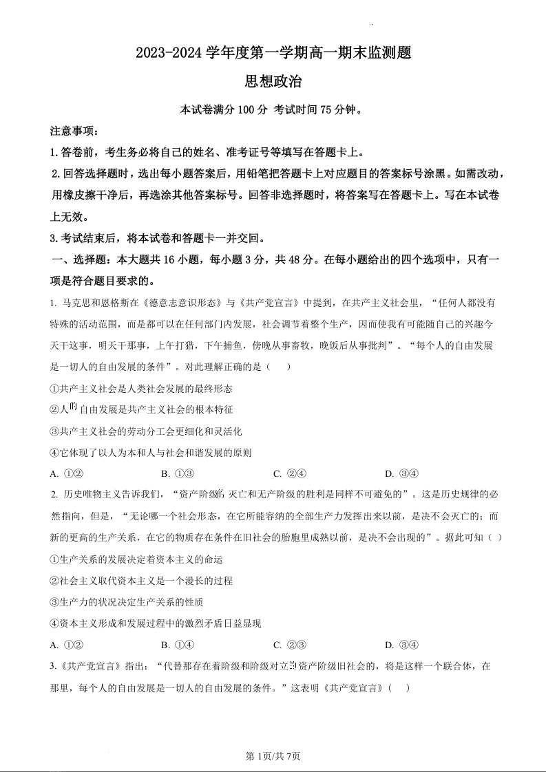 广东省阳江市高新区2023-2024学年高一上学期1月期末测试政治(原卷版)