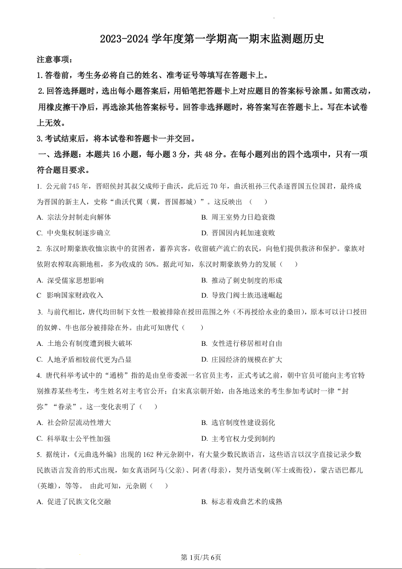 广东省阳江市高新区2023-2024学年高一上学期1月期末测试历史(原卷版)