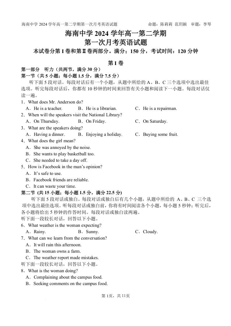 海南省海口市海南中学2023-2024学年高一下学期3月月考英语