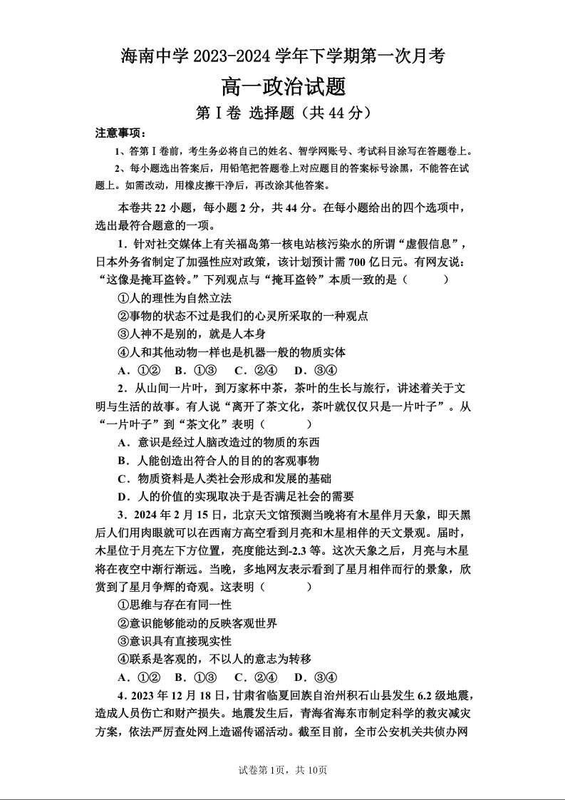 海南省海口市海南中学2023-2024学年高一下学期3月月考政治+答案