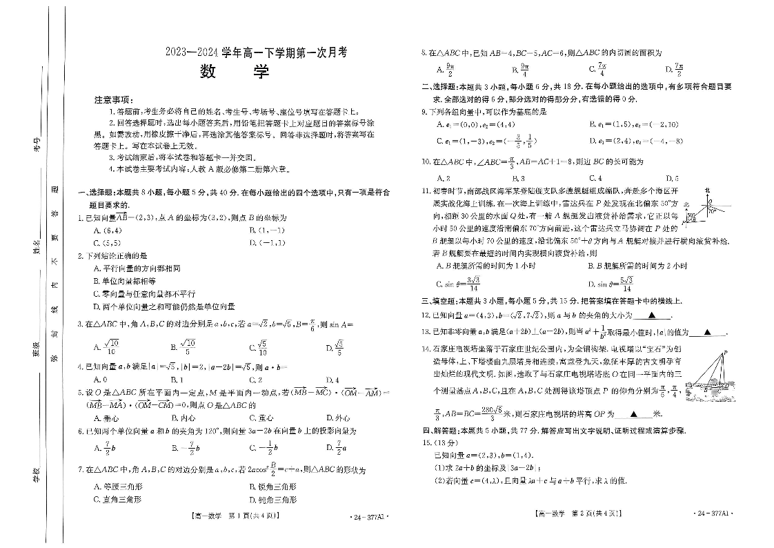 河南省部分学校2023-2024学年高一下学期3月月考数学