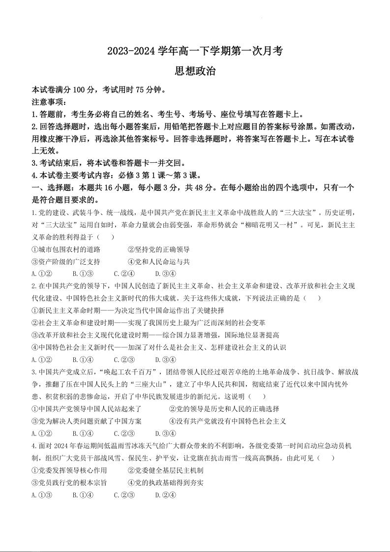 河南省部分学校2023-2024学年高一下学期3月月考政治+答案