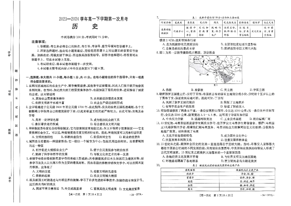 河南省部分学校2023-2024学年高一下学期3月月考历史