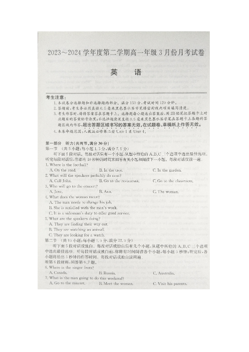 河北省沧州市沧州十校2023-2024学年高一下学期3月月考英语+答案