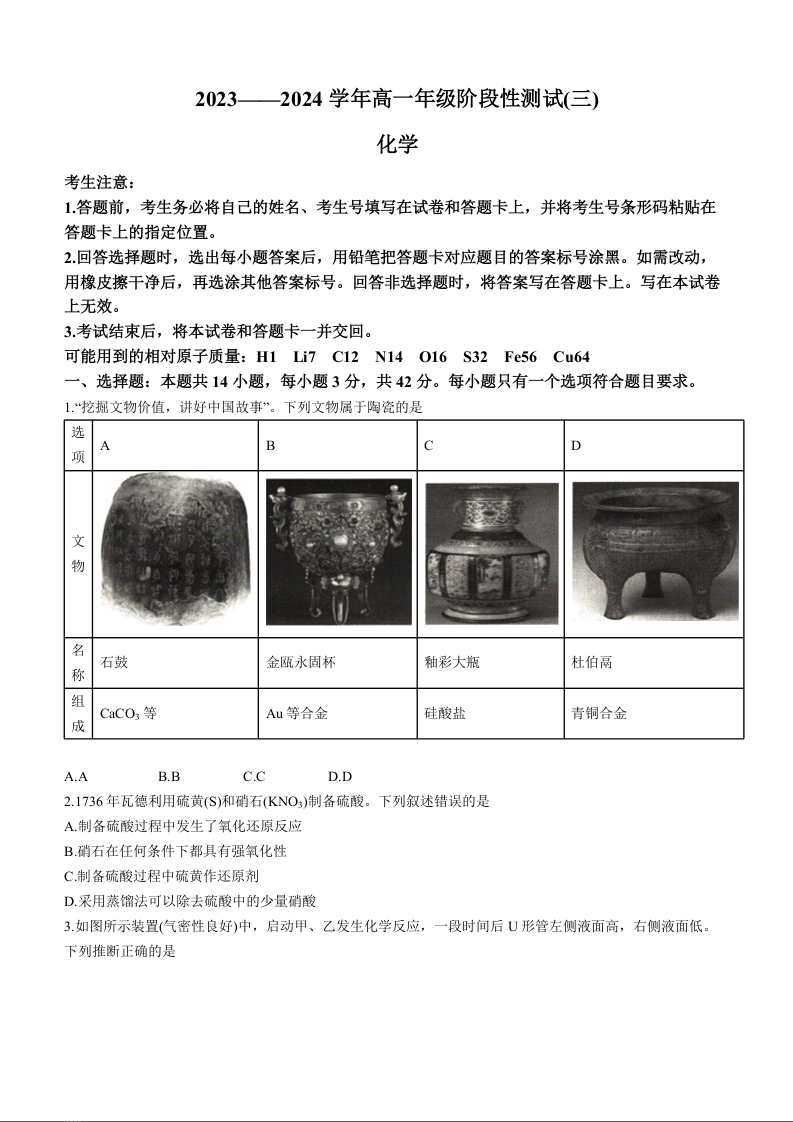 河南省濮阳市部分学校2023-2024学年高一下学期3月月考化学