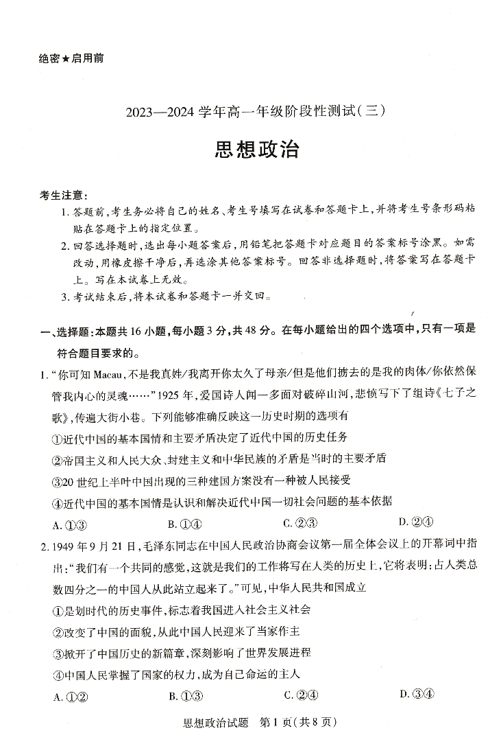河南省濮阳市部分学校2023-2024学年高一下学期3月月考政治