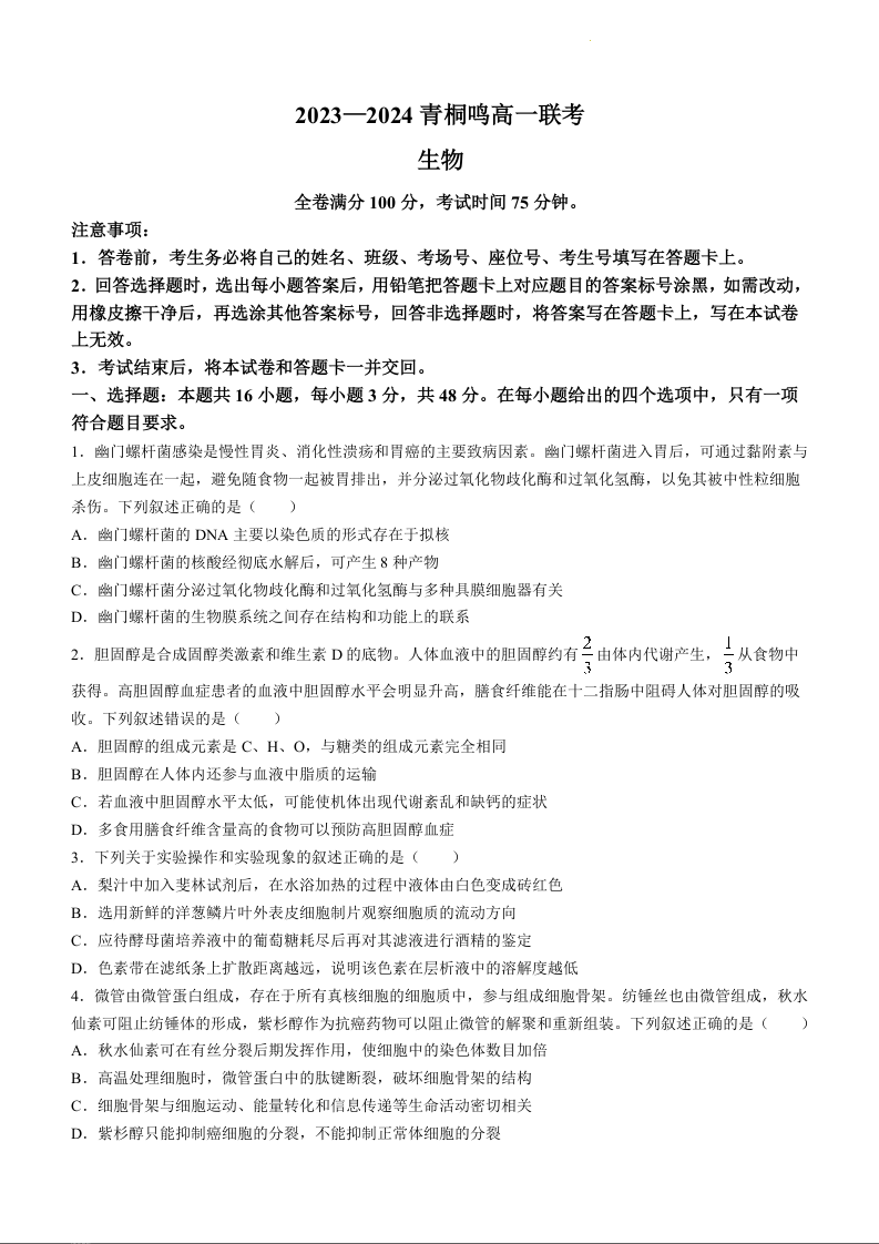 河南省商丘市青桐鸣大联考2023—2024学年高一下学期3月月考生物