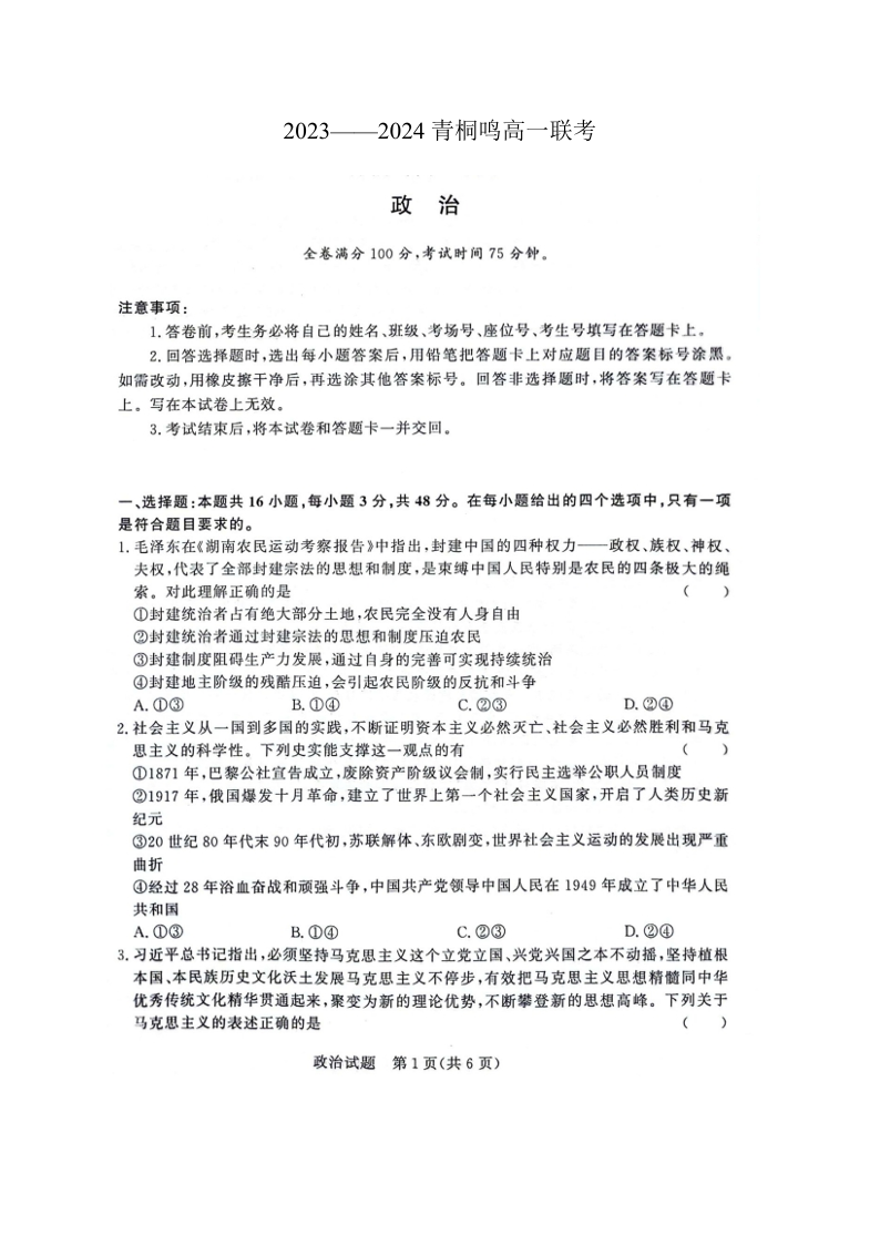 河南省商丘市青桐鸣大联考2023—2024学年高一下学期3月月考政治