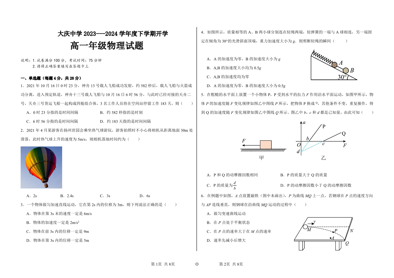 黑龙江省大庆市大庆中学2023-2024学年高一下学期开学考试物理