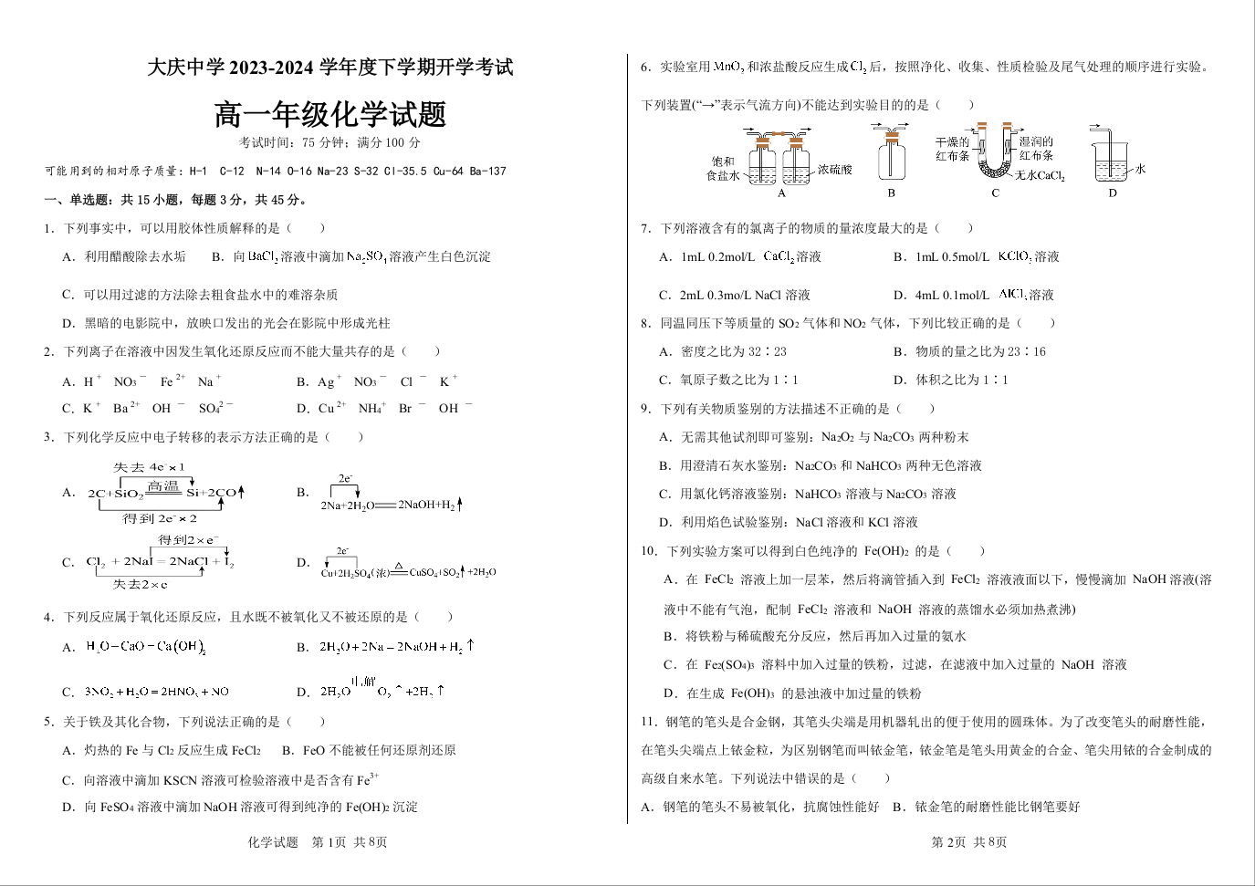 黑龙江省大庆市大庆中学2023-2024学年高一下学期开学考试化学