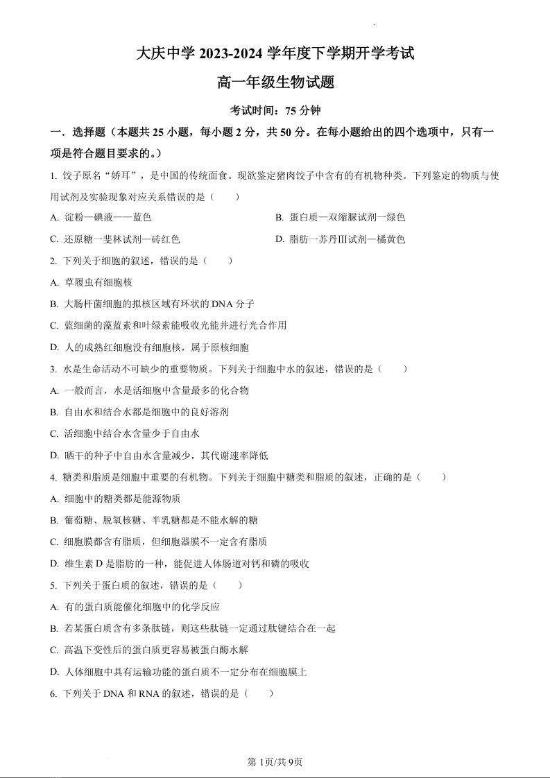 黑龙江省大庆市大庆中学2023-2024学年高一下学期开学考试生物(原卷版)