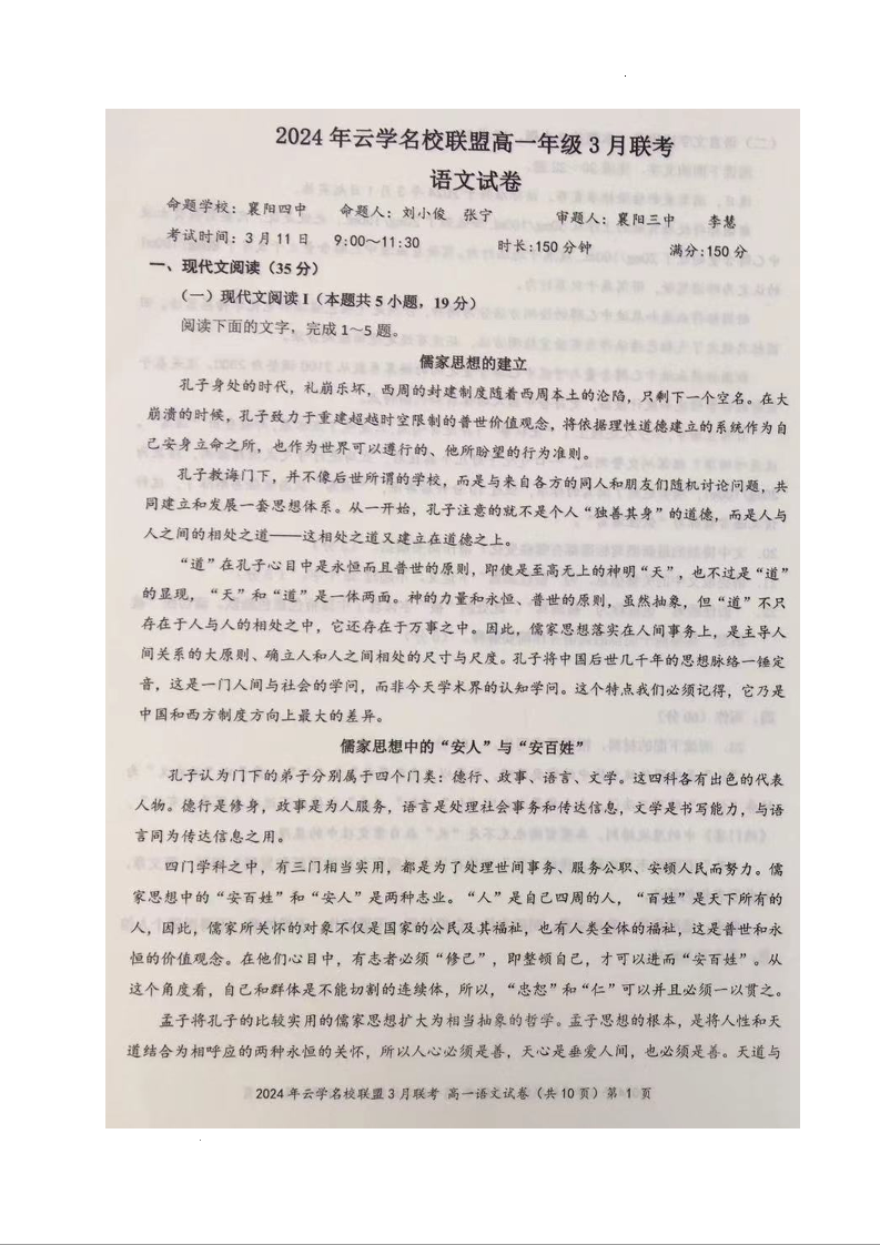 湖北省云学名校联盟2023-2024学年高一下学期3月联考语文