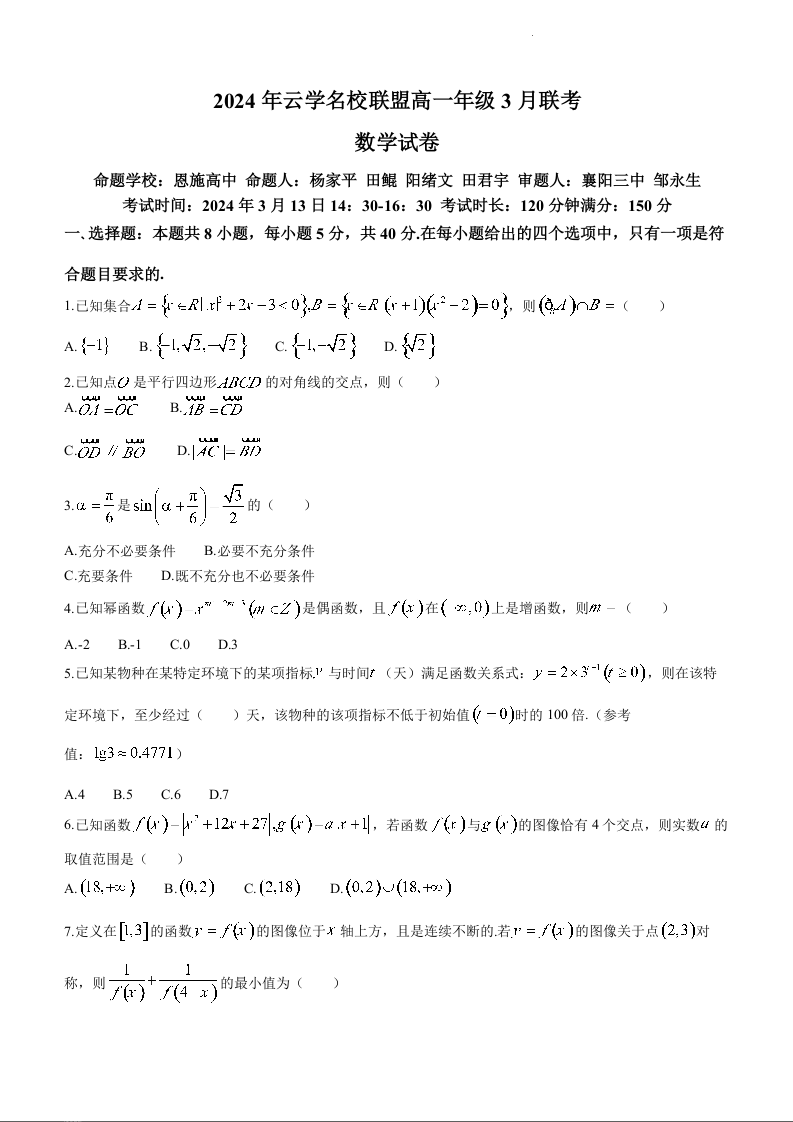 湖北省云学名校联盟2023-2024学年高一下学期3月联考数学