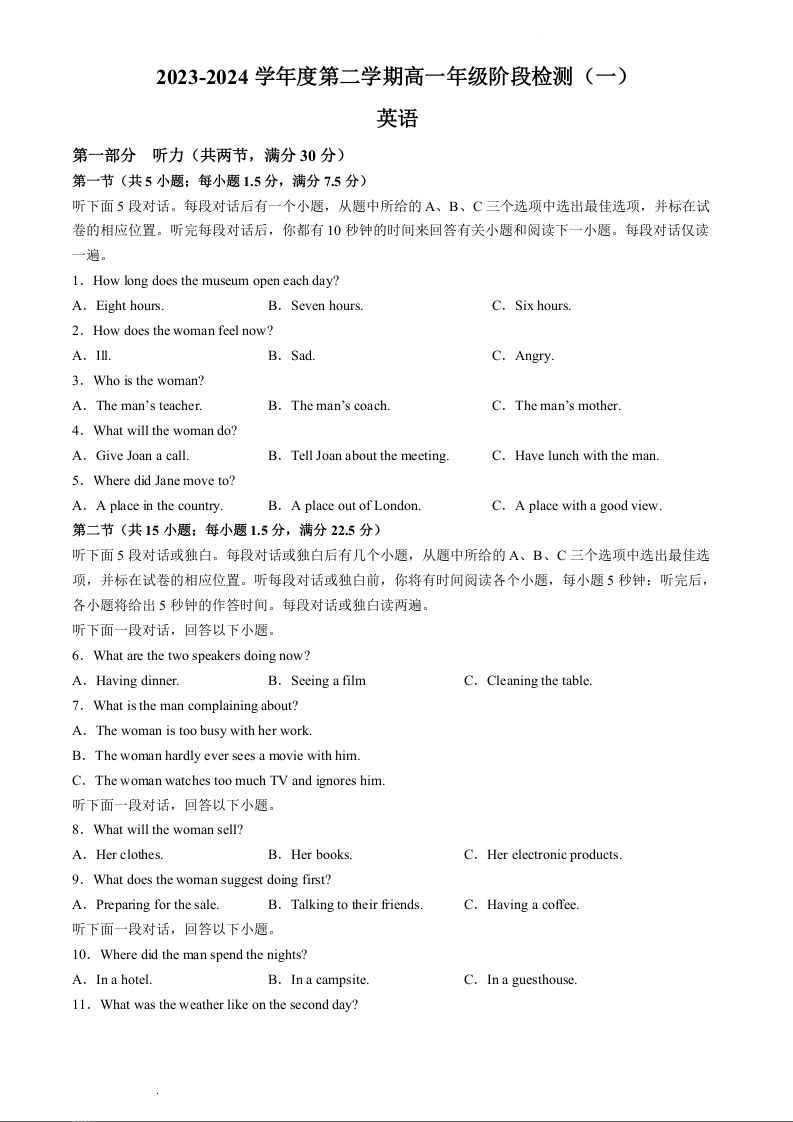 江苏省南通市海安高级中学2023-2024学年高一下学期第一次月考英语+答案