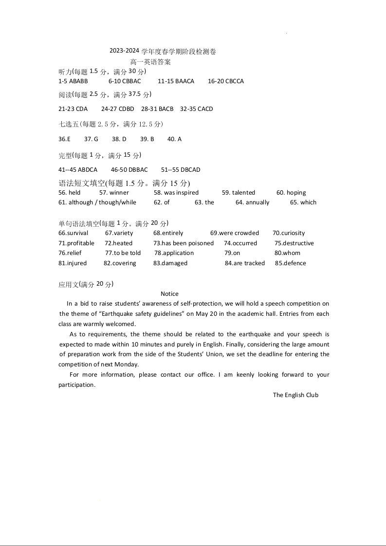 江苏省无锡市江阴市两校联考2023-2024学年高一下学期阶段检测英语答案