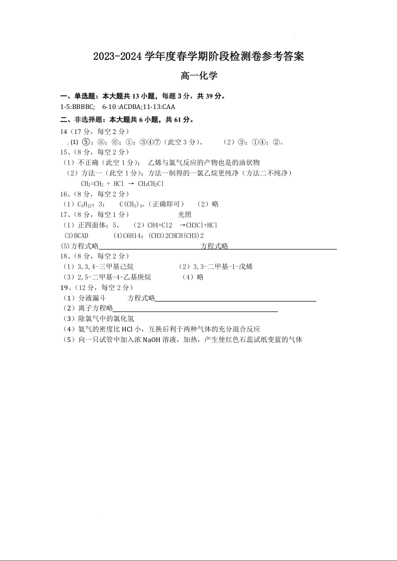 江苏省无锡市江阴市两校联考2023-2024学年高一下学期阶段检测化学答案