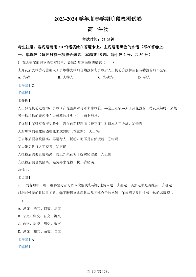 江苏省无锡市江阴市两校联考2023-2024学年高一下学期阶段检测生物(精品解析版)