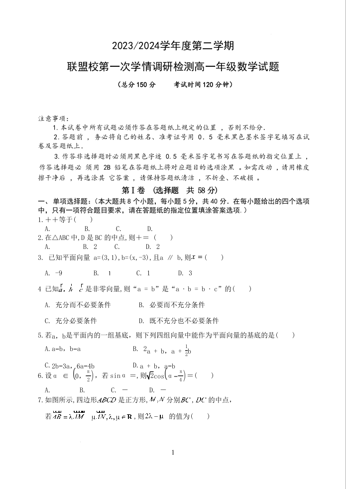 江苏省盐城市五校联盟2023-2024学年高一下学期第一次学情调研检测数学