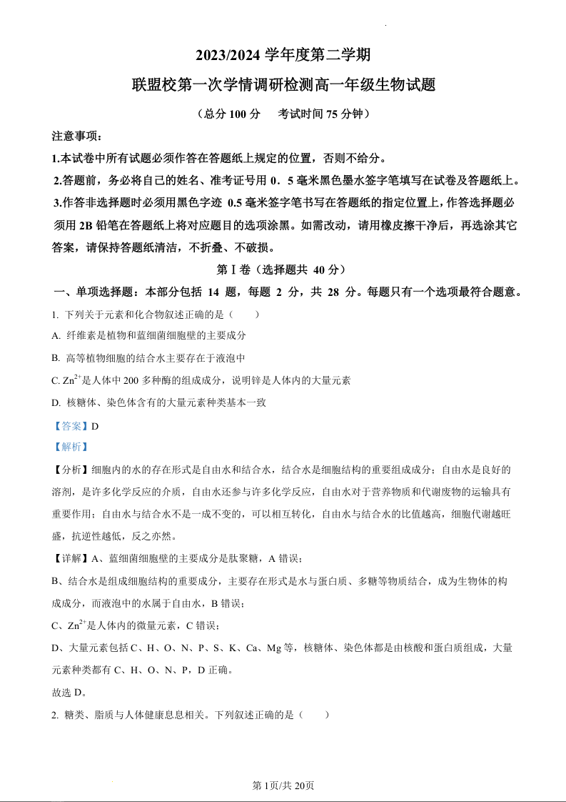 江苏省盐城市五校联盟2023-2024学年高一下学期第一次学情调研检测生物(精品解析版)