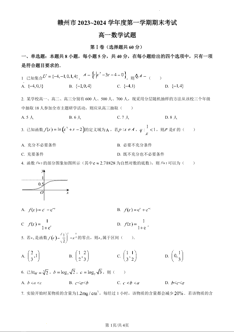 江西省赣州市2023-2024学年高一上学期期末考试数学(原卷版)