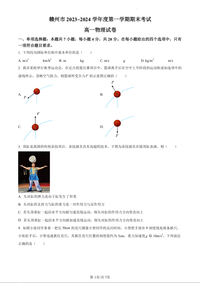 江西省赣州市2023-2024学年高一上学期期末考试物理(原卷版)
