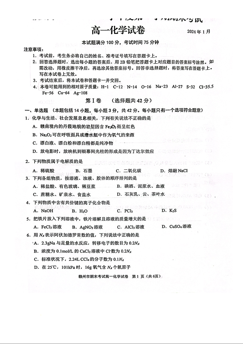江西省赣州市2023-2024学年高一上学期期末考试化学