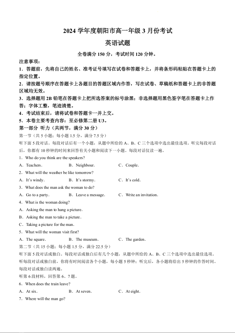 辽宁省朝阳市2023-2024学年高一下学期3月份考试英语+答案