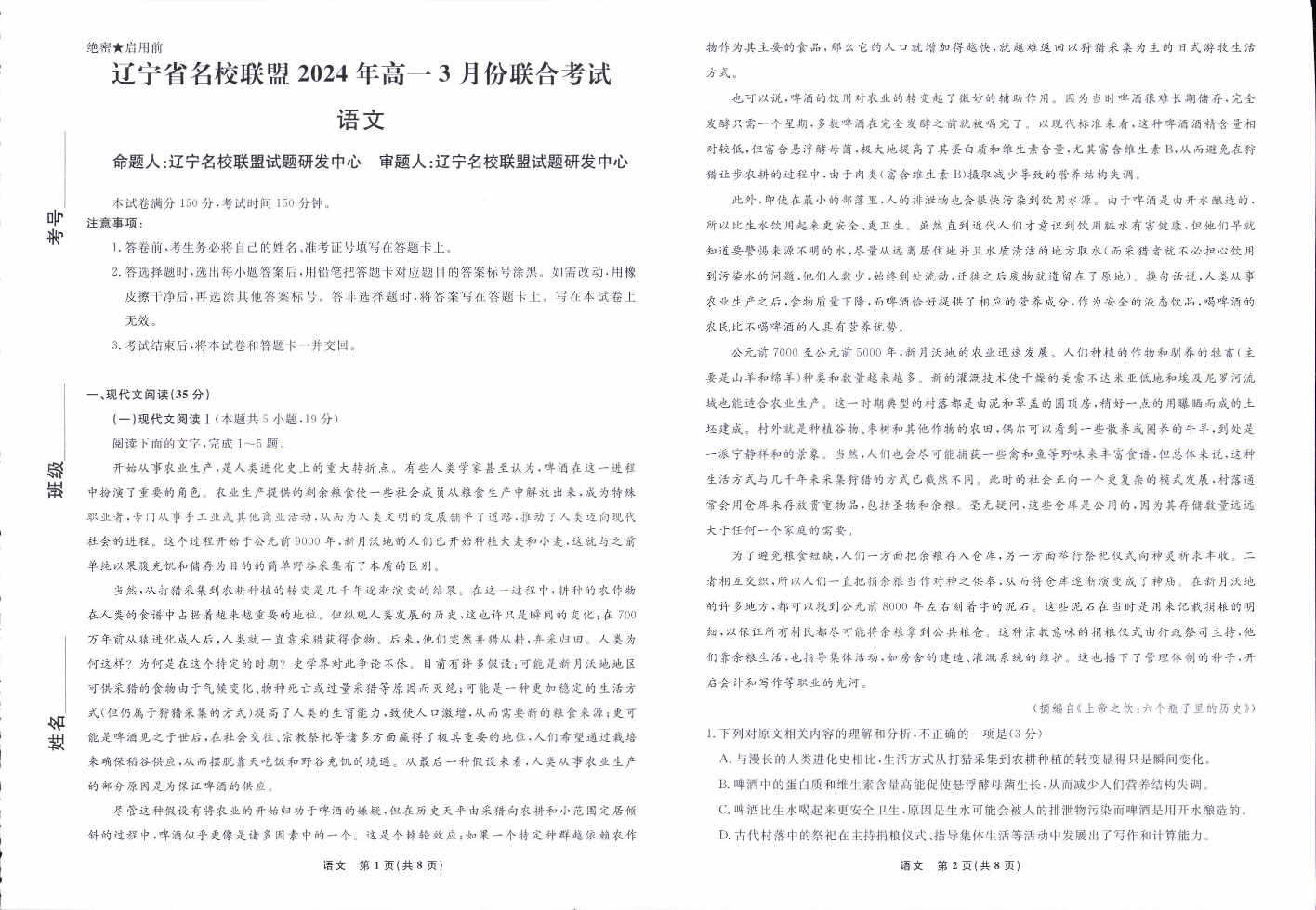 辽宁省名校联盟2023-2024学年高一下学期3月联合考试语文