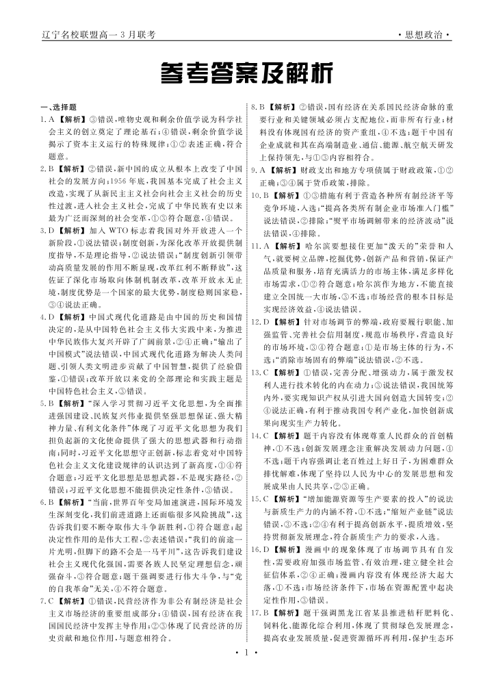 辽宁省名校联盟2023-2024学年高一下学期3月联合考试政治答案