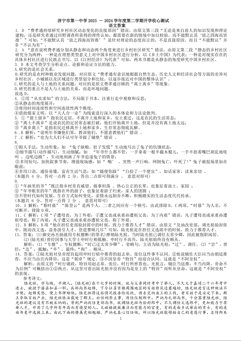 山东省济宁市第一中学2023-2024学年高一下学期开学考试语文答案